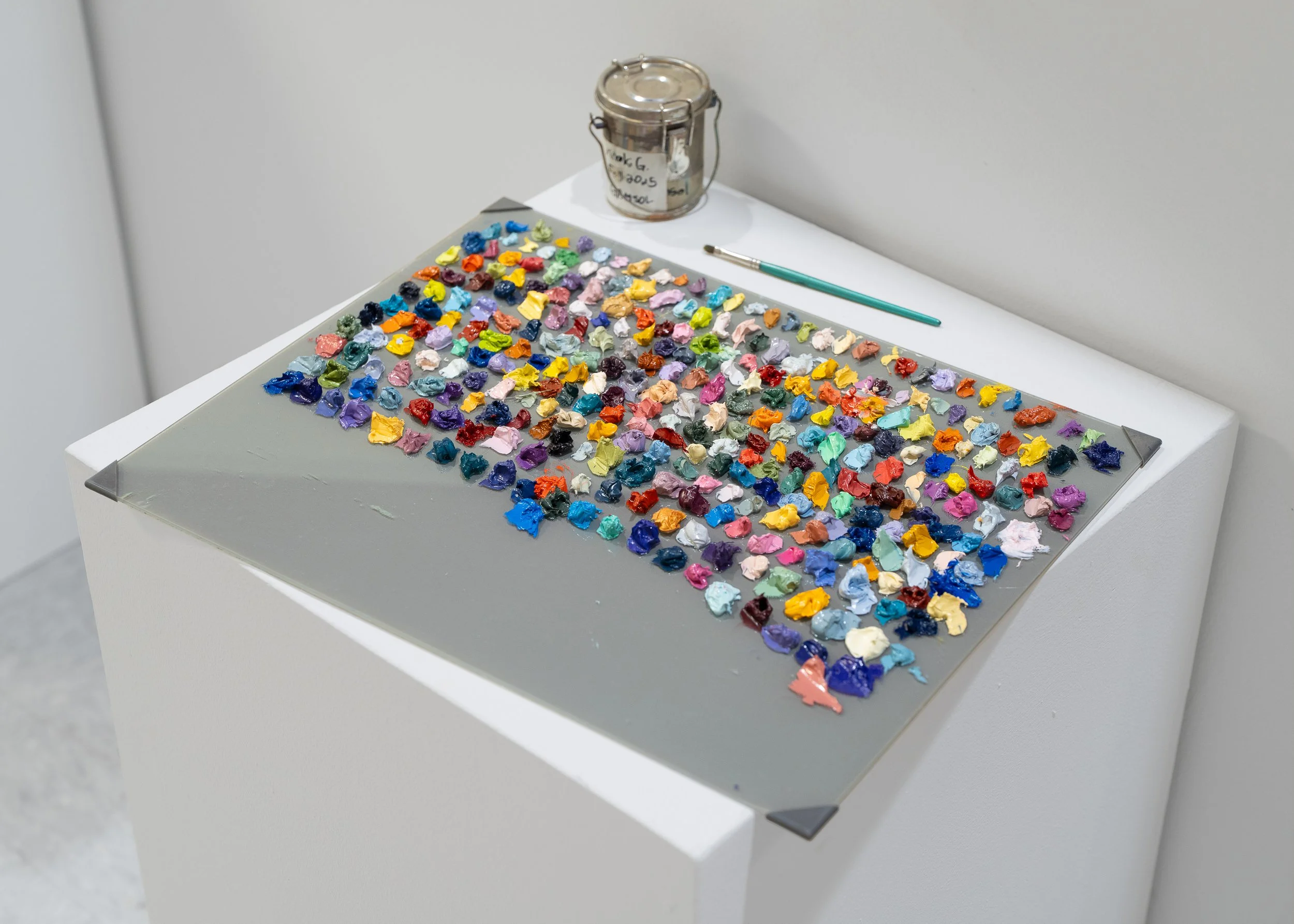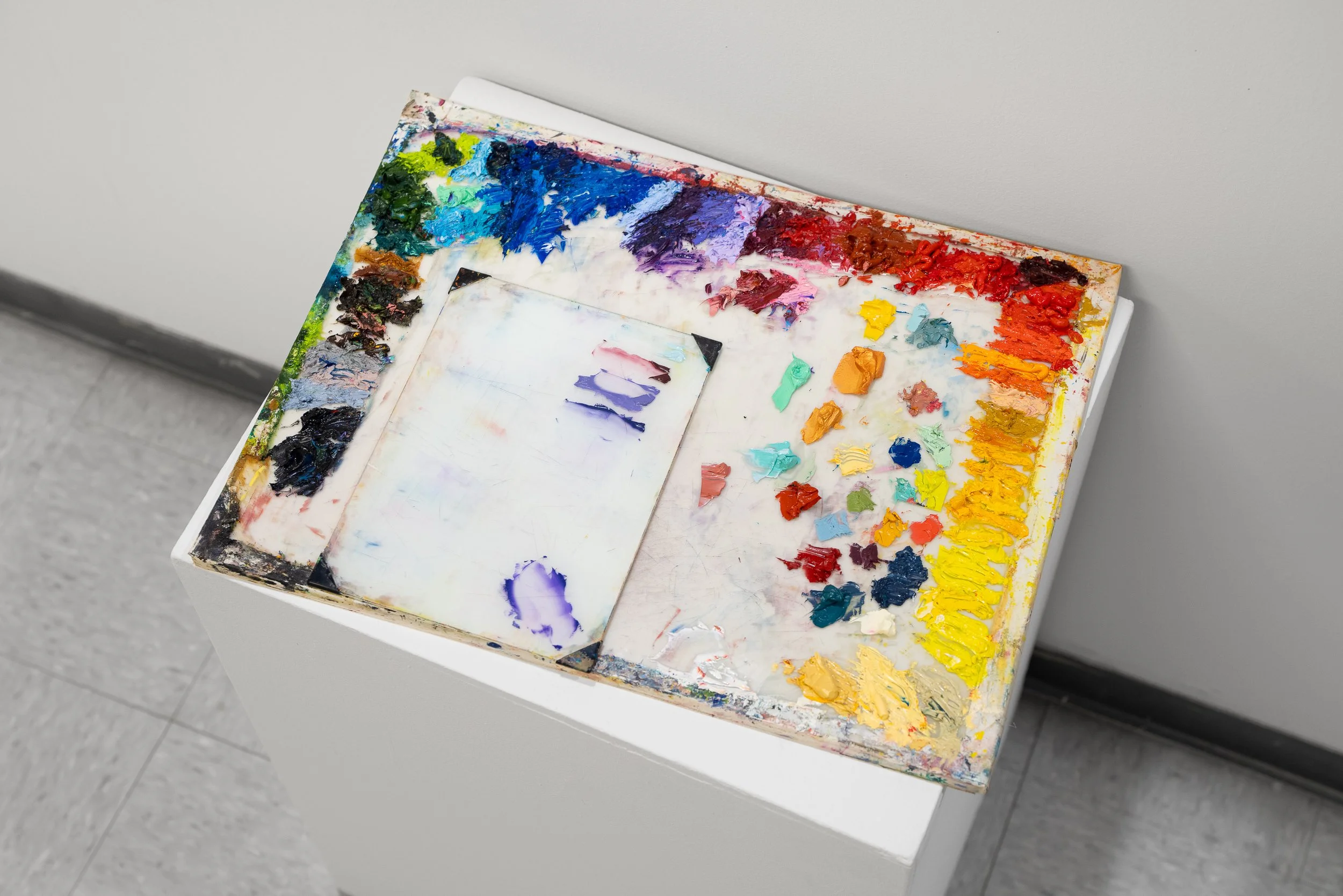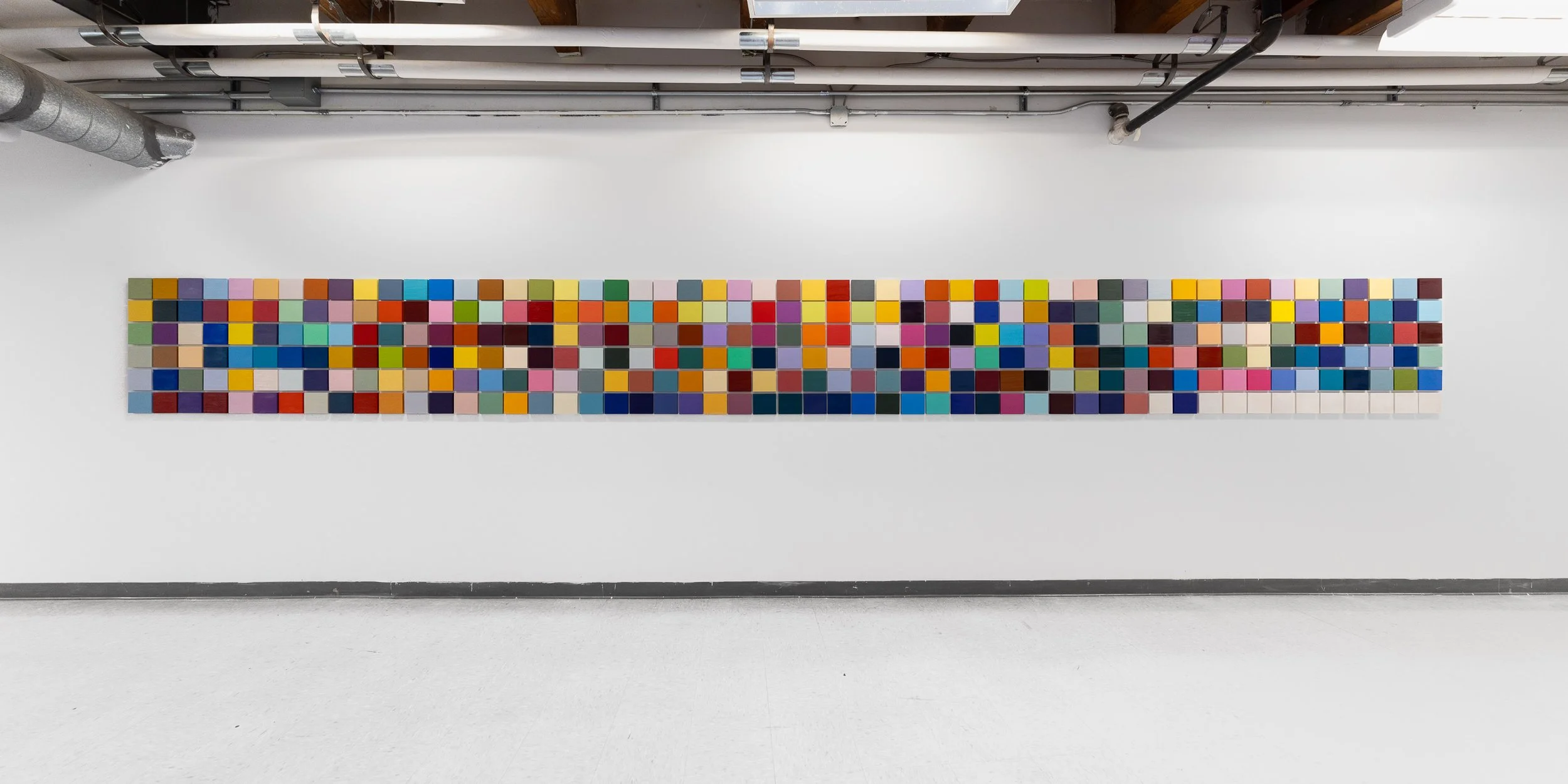 Seeing Sound is a visual translation of an auditory archive, a way of mapping what it means to listen, to care, and to remember through color. The work is composed of 318 individual panels, each representing a song from 5 Seconds of Summer’s discography, including their collaborations, unreleased tracks, and solo work. The project began as an attempt to give sound a physical form, but it quickly became something more intimate. It became a form of self-portraiture built from years of listening.The process is meditative, almost ritualistic. I listened to each song over and over, letting it play until the right color surfaced; until the sound felt like something I could hold. I mixed and remixed paint, adjusted hue and saturation, layered and repainted until the emotion of the track was captured through color alone. The repetition of this process, 318 times over, mirrors the obsessive nature of fandom itself, the way devotion often blurs the line between artist and listener, self and sound. Each panel holds a personal association, a memory, or a sensory echo. I pull the inspiration from the color of a lyric, the feeling of a concert, the weight of a moment that music carried me through. When assembled together, the grid becomes an archive of attachment, a record of growth and evolution, both mine and the band’s. It is an act of preservation, an attempt to document how songs, over time, become part of the structure of self.Seeing Sound also challenges the boundaries between abstraction and representation. While it appears as a grid of pure color, the work is rooted in deeply personal associations and experiences; each hue is a representation of sound and emotion rather than an abstraction of it. The result is both systematic and deeply sentimental, a study in how color, like music, can hold memory, emotion, and transformation all at once. To me, this work is more representational then my work in the past. Ultimately, this project is about translation: the effort to turn what is heard into what can be seen and felt. It’s about music as a mirror, about devotion as a form of survival, and about the possibility that, sometimes, seeing sound can mean seeing yourself more clearly too.-Meraki Gardner ‘25